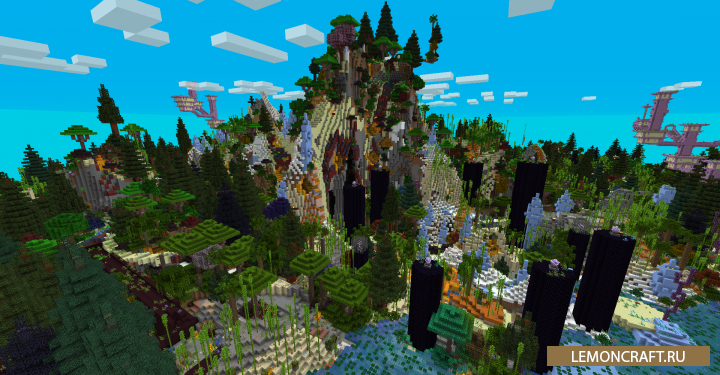 Мод на все биомы в одном мире World Blender позволяет собрать все существующие биомы и соединить их все в одном мире. После установки мода вы сможете наблюдать структуры из энд мира, подземелья в новом измерении, например деревья и дорожки будут из нижнего мира, а деревья из энд мира. Рядом с простыми деревьями будут торчать из земли глыбы льда.